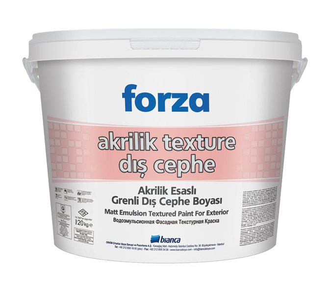 Forza Akrilik Texture uygulaması yapılacak yüzeyler; her türlü kir, yağ ve tozdan, eski boya kalıntılarından arındırılmış temiz ve kuru olmalıdır. Yeni sıvalı yüzeylere 2 ile 4 hafta kuruması için zaman verilmelidir. İlk defa boyanacak ve çok emici yüzeyler için mutlaka Forza Akrilik Dış Cephe Astarı kullanılmalıdır. Astar uygulamasından sonra en az 6 saat beklenmelidir. İstenilen desene uygun rulo seçimi ile yüzeye tek kat olarak Forza Akrilik Texture uygulaması yapılır. Uygulama sırasında yüzey ve hava ısısı en az +5°C ve en çok +30°C olmalıdır.